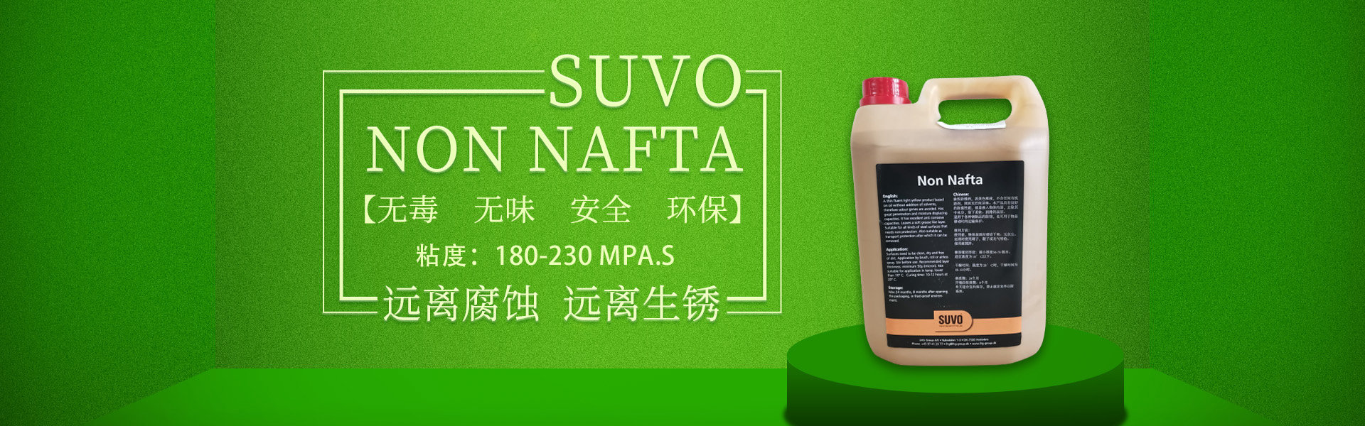 SUVO Non Nafta 是一款無毒、無味、安全、環(huán)保的油基/蠟基防銹產(chǎn)品,不含溶劑,內(nèi)含超強(qiáng)的防腐劑。 涂刷本產(chǎn)品后,會(huì)在被保護(hù)的工件表面形成一層80-100微米厚的油脂、蠟基保護(hù)膜,保護(hù)金屬產(chǎn)品免受惡劣環(huán)境侵害,遠(yuǎn)離腐蝕,遠(yuǎn)離生銹。 產(chǎn)品適合于鋼鐵制品在陸地存儲(chǔ)或海上運(yùn)輸過程中的長(zhǎng)期防腐,防銹。本產(chǎn)品非常易于被石油精/煤油清洗劑清除,清洗過程不損傷工件表面,不污染施工環(huán)境。